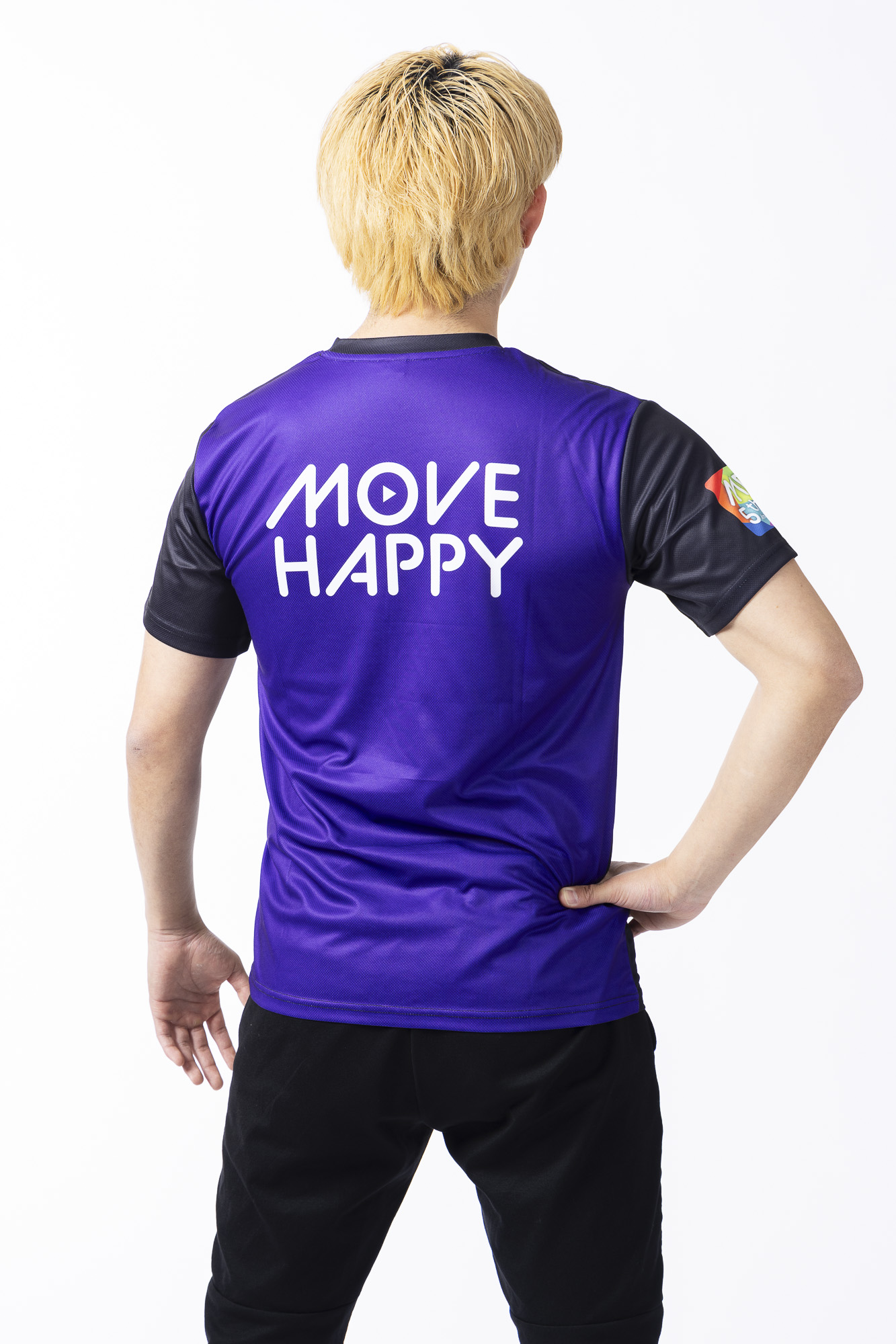 前面には「MOVE BODY」、後面には「MOVE HAPPY」、右肩にはレインボーバージョンの5周年ロゴをプリントした限定Tシャツ。
