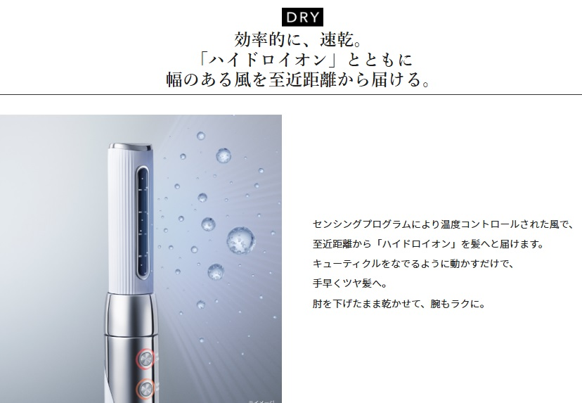 スティックの持ち手部分の内部にイオナイザーを搭載。吹出口のセラミックコーティングとの融合技術により、「ハイドロイオン」を発生させます。