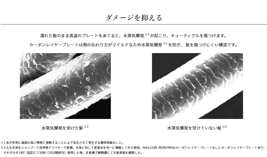 リファカールアイロン プロの「カーボンレイヤープレート」はプロの技をテクノロジーで再現。低反発コートで髪を優しく包み込み、高密度炭素とヒートセンサーで髪の水分量を保ちながら均一に熱を伝えることで、美しいカールがつづきます。