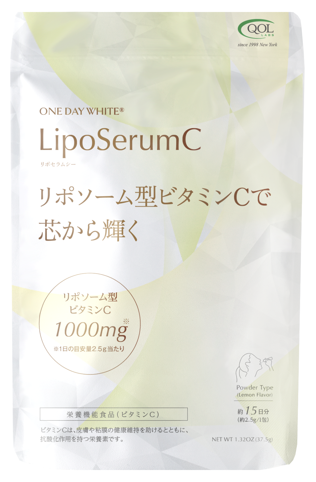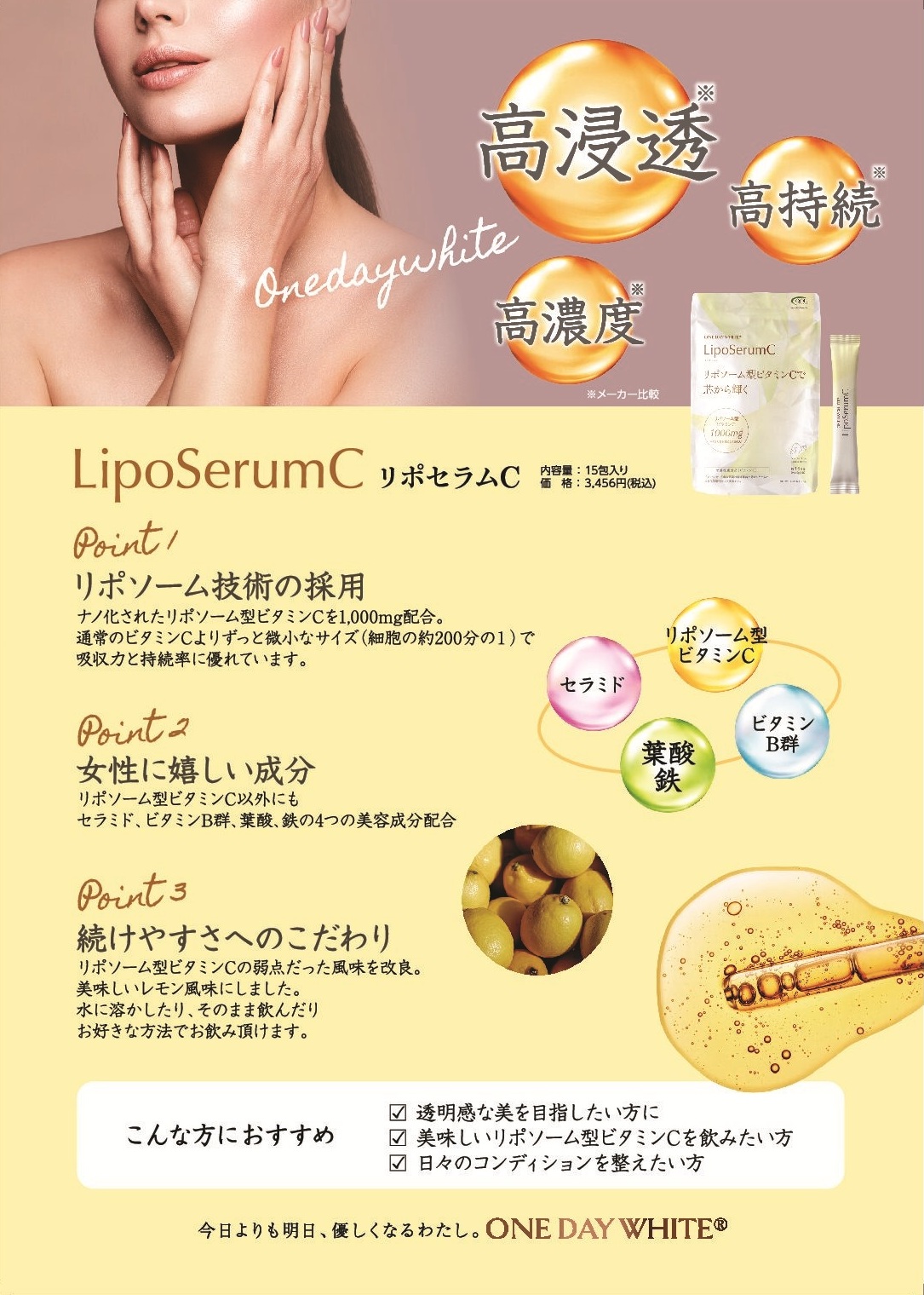 リポソーム型ビタミンCのほか、セラミド、ビタミンB群、葉酸と不足しがちな美容成分を熱を加えず粉末状にしたサプリメント。