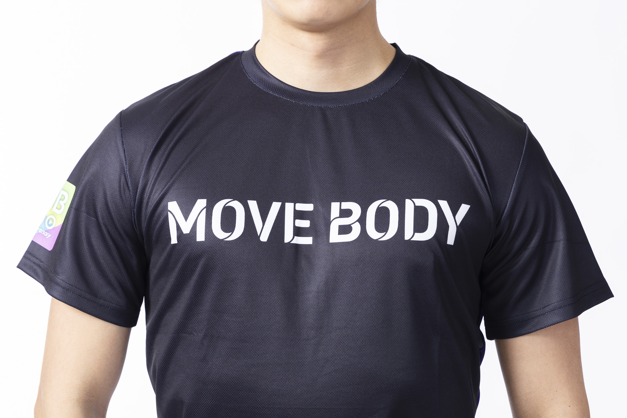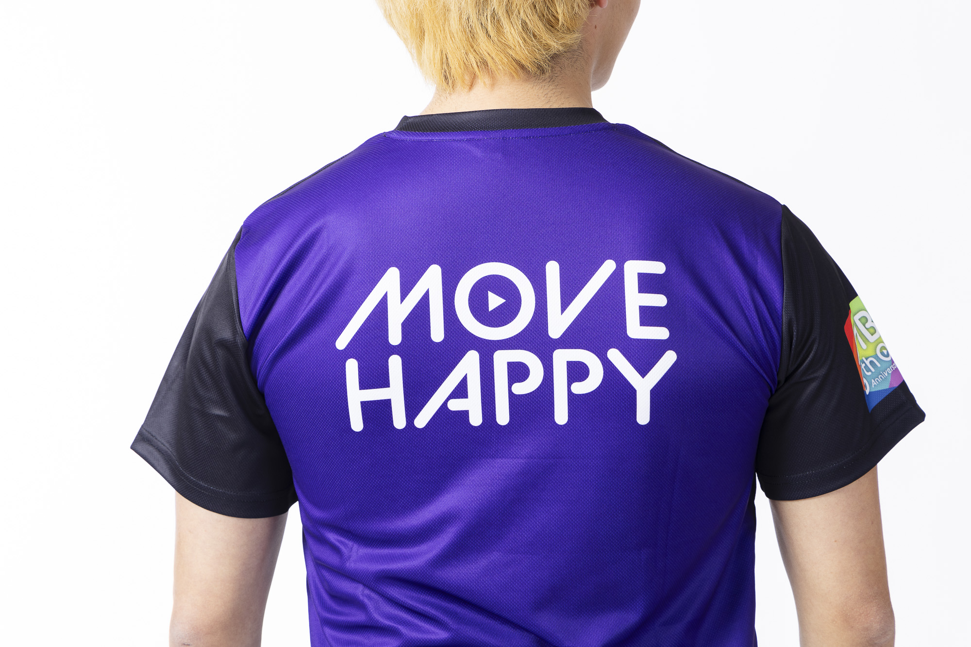 前面には「MOVE BODY」、後面には「MOVE HAPPY」、右肩にはレインボーバージョンの5周年ロゴをプリントした限定Tシャツ。