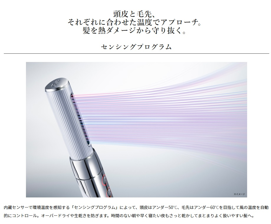 内蔵センサーで環境温度を感知し、頭皮は50℃以下、毛先は60℃以下を目指して温度を自動的にコントロール。熱ダメージを抑え、忙しい朝もまとまりよく扱いやすい髪へ。