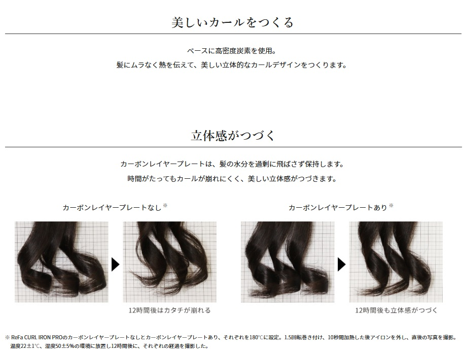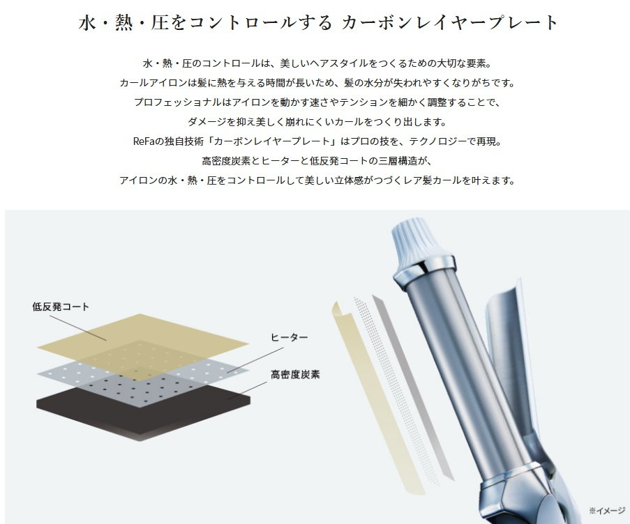 リファカールアイロン プロの「カーボンレイヤープレート」はプロの技をテクノロジーで再現。低反発コートで髪を優しく包み込み、高密度炭素とヒートセンサーで髪の水分量を保ちながら均一に熱を伝えることで、美しいカールがつづきます。