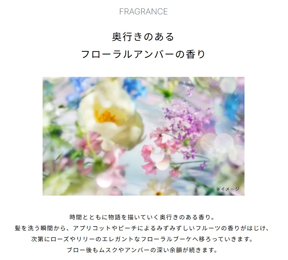 髪を洗う瞬間から、アプリコットやピーチによるみずみずしいフルーツの香りがはじけ、次第にローズやリリーのエレガントなフローラルブーケへ移ろっていきます。